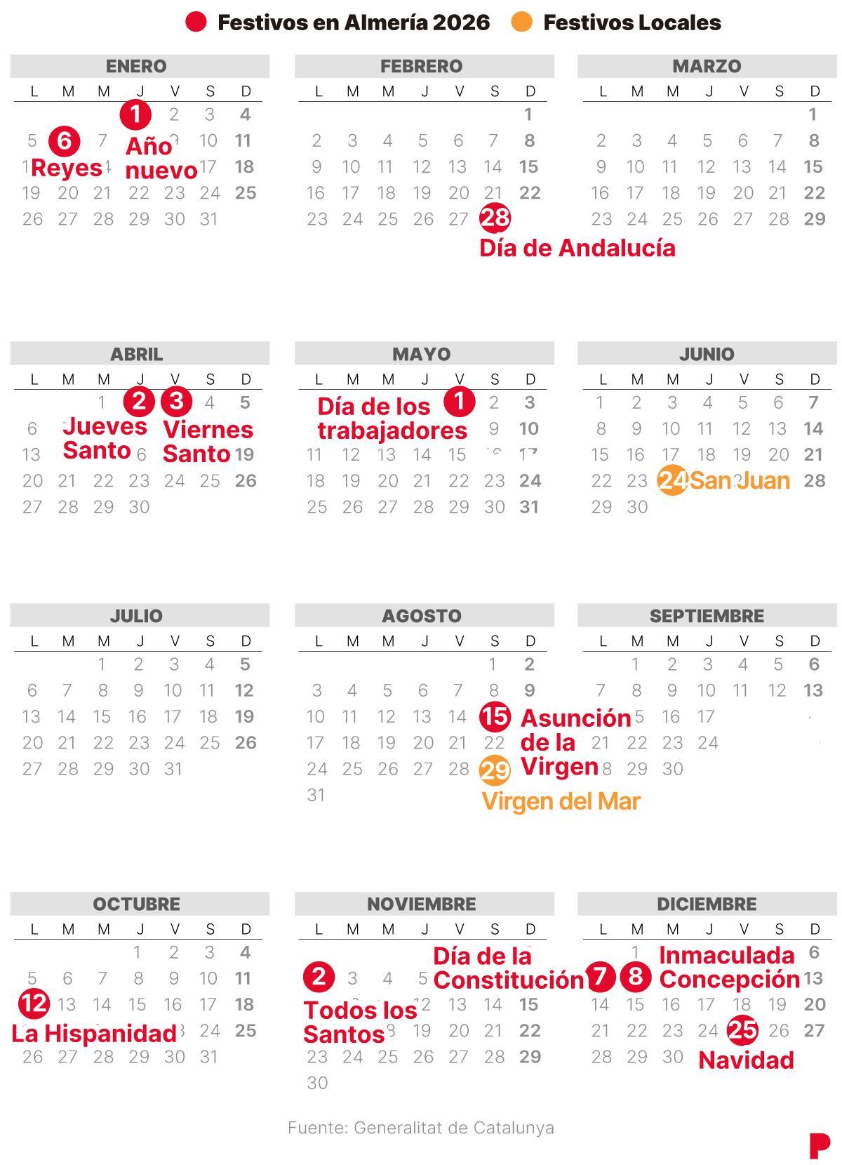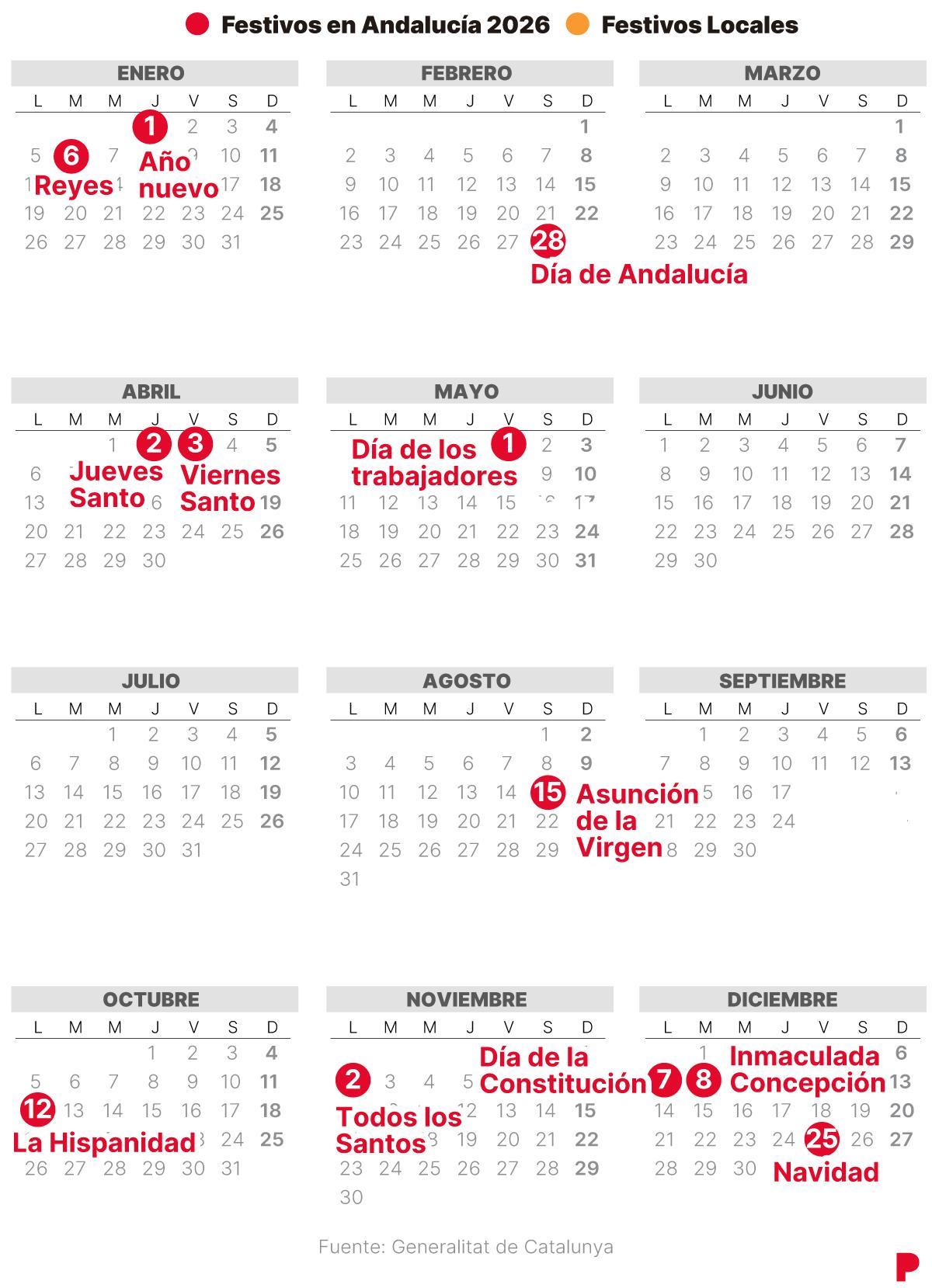 El calendario laboral de Andalucía para 2026 contempla 12 festivos oficiales distribuidos entre días de ámbito nacional, autonómico y local. La publicación, realizada por la Consejería de Trabajo, establece la fecha de cada día festivo y su carácter intransferible.